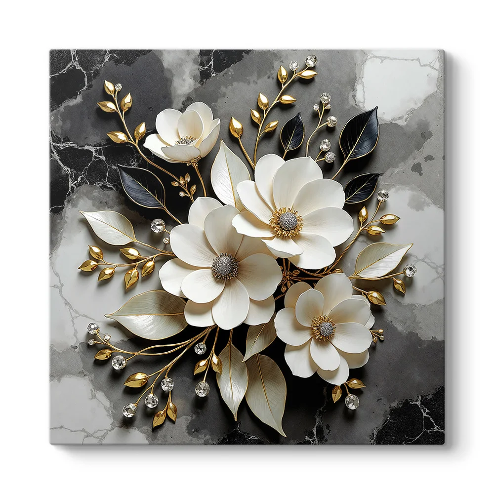 Altın detaylı dallar ve beyaz çiçeklerin zarif kompozisyonuyla tasarlanan bu modern kanvas tablo, yaşam alanlarında dikkat çekici ve şık bir duvar dekoru oluşturmak isteyenler için özel bir tasarım sunar. Siyah ve gri mermer görünümlü arka plan ile altın tonlarının uyumu tabloya güçlü ve estetik bir karakter kazandırır. Bu dengeli renk kombinasyonu sayesinde tablo hem modern hem de lüks dekorasyon tarzlarına uyum sağlar.