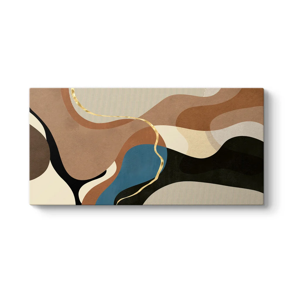 Modern dekorasyonun en güçlü temsilcisi olan soyut formlar, bu özel tasarım kanvas tabloda hayat buluyor. Kahve ve krem tonlarının sakinleştirici etkisi, derinlik katan mavi geçişler ve kompozisyonu zenginleştiren altın varak görünümlü şeritlerle birleşerek mekanınıza sofistike bir atmosfer kazandırıyor. Evinizin veya ofisinizin havasını değiştirecek bu şık duvar dekoru, modern sanatın zarafetini yaşam alanınıza taşıyor.