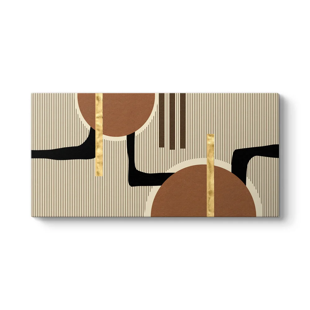 Geometrinin mükemmel dengesi ve renklerin uyumu duvarlarınıza taşınıyor. Bu özel tasarım geometrik kanvas tablo, arka plandaki dikey çizgilerin yarattığı derinlik hissi üzerine kurgulanmış; terracotta'nın (kiremit) sıcaklığını, siyahın netliğini ve altın varak görünümlü dikey şeritlerin lüks ışıltısını bir araya getiriyor. Düzenli ama dinamik yapısıyla modern mekanların enerjisini yükseltecek bir duvar dekoru.