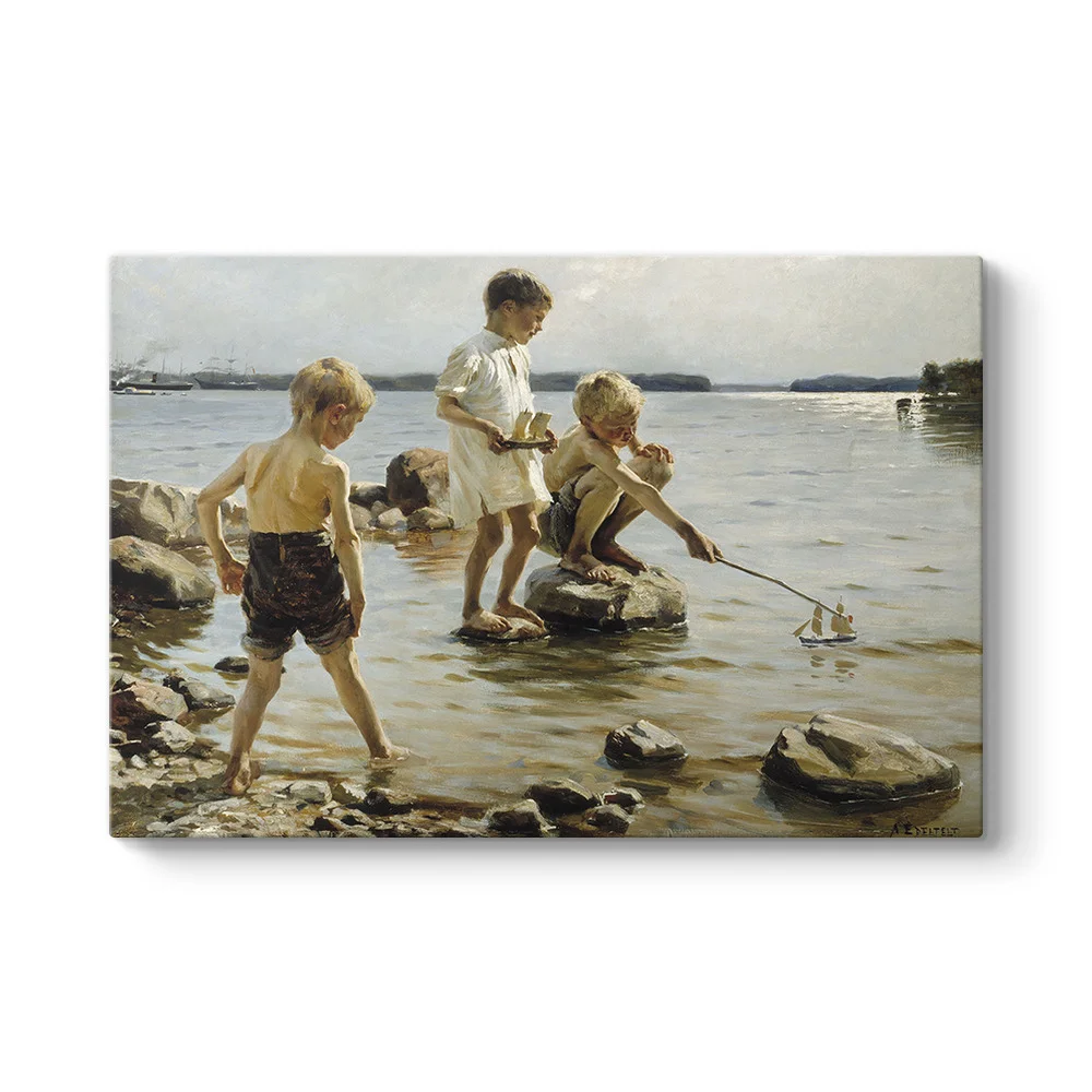 Duvarlarınızda sonsuz bir yaz günü ve çocukluk anılarınızın masumiyetini hissetmek ister misiniz? İskandinav sanatının altın çağına damga vuran Albert Edelfelt'in 1884 tarihli başyapıtı "Kıyıda Oynayan Çocuklar" (Boys Playing on the Shore), denizin dinginliğini ve oyunun ciddiyetini evinize getiriyor.