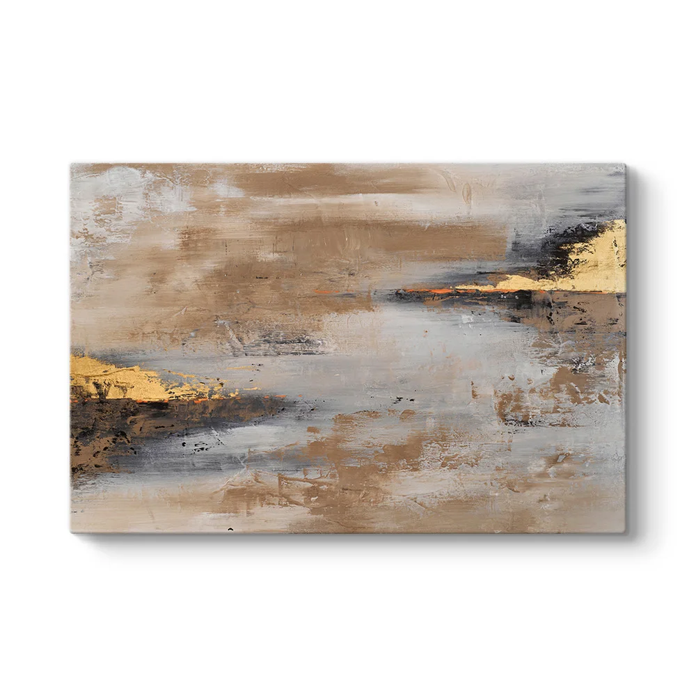 Bu eser, yatay fırça darbeleriyle soyut bir ufuk çizgisini andırır. Bej, krem ve kahve tonlarının oluşturduğu doğal zemine eşlik eden altın sarısı ve siyah detaylar, sanki gün batımının yansımasını veya eskitme bir metalin şıklığını çağrıştırır. Özellikle ahşap mobilyalar, deri koltuklar veya altın renkli aksesuarlarla (sehpa ayakları, avizeler vb.) dekore edilmiş salonlarda mükemmel bir uyum sağlar.