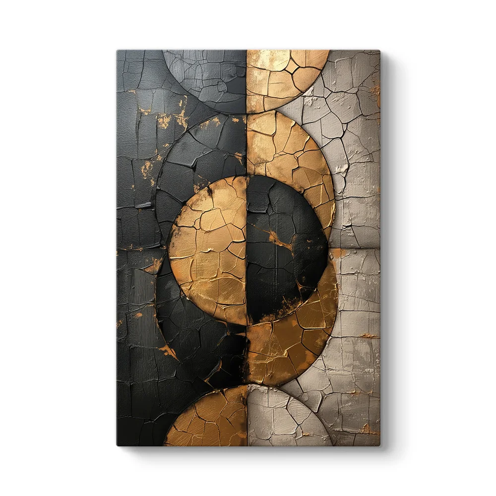 Kusursuz geometrinin, doğal dokularla buluştuğu noktayı keşfedin. "Modern Siyah ve Altın Geometrik Daireli Soyut Tablo", birbirine kenetlenmiş daire formlarını, antik bir seramiği andıran çatlatma (craquelure) efektleriyle harmanlayarak duvarlarınıza zamansız bir estetik katıyor. TabloShop ayrıcalığıyla ücretsiz kargo ile kapınıza gelen bu eser, modern dekorasyona karakteristik bir imza atıyor.