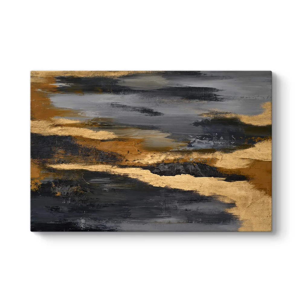 Bu tasarım, ışık ve gölge oyunlarının en güçlü halini yansıtır. Zemindeki koyu antrasit ve siyah fırça darbeleri (görünümü), tablonun üzerinden akan altın nehri andıran detaylarla aydınlanır. Bu güçlü kontrast, eseri sadece bir dekorasyon objesi olmaktan çıkarıp, odanın tüm enerjisini yükselten bir "güç simgesi" haline getirir. Özellikle geniş ve yatay duvarlarda, mekanın atmosferini tek başına değiştirebilecek bir etkiye sahiptir.