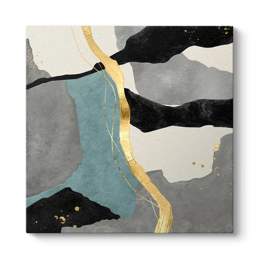 Modern dekorasyonun en asil renkleri bu tasarımda buluşuyor. Soğuk gri ve siyah tonlarının oluşturduğu güçlü zemin, aralara giren petrol mavisi (teal) bloklar ve altın renkli şeritlerle ısınıyor. Doğal taş ve mermer esintileri taşıyan bu dijital tasarım, yaşam alanlarına hem maskülen bir ciddiyet hem de sanatsal bir zarafet katmak için kurgulandı.