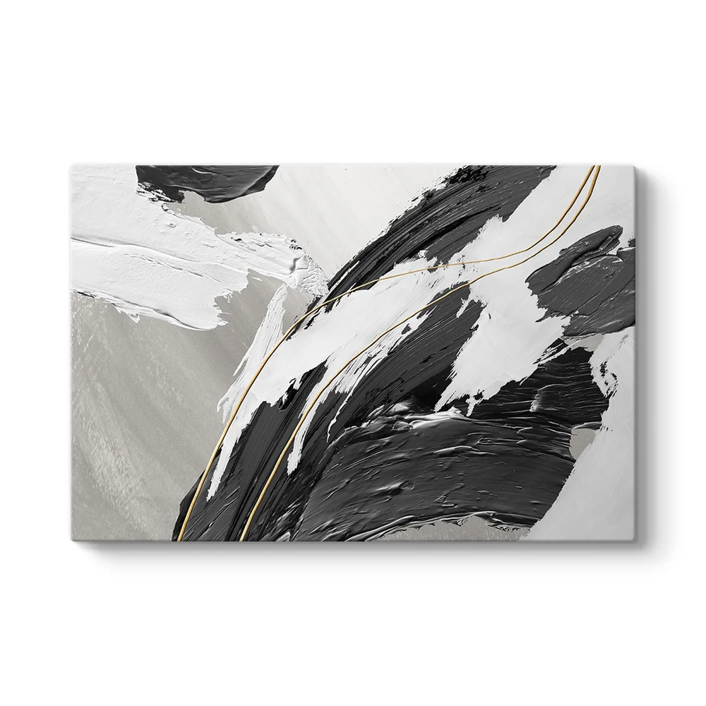 Modern dekorasyonun vazgeçilmezi olan siyah-beyaz zıtlığı, bu özel tasarımda altın (gold) rengi detaylarla buluşuyor. "Siyah Beyaz ve Altın Renk Geçişli Modern Soyut Tablo", mekanınıza derinlik ve zenginlik katmak için tasarlanmış dijital bir sanat eseridir.