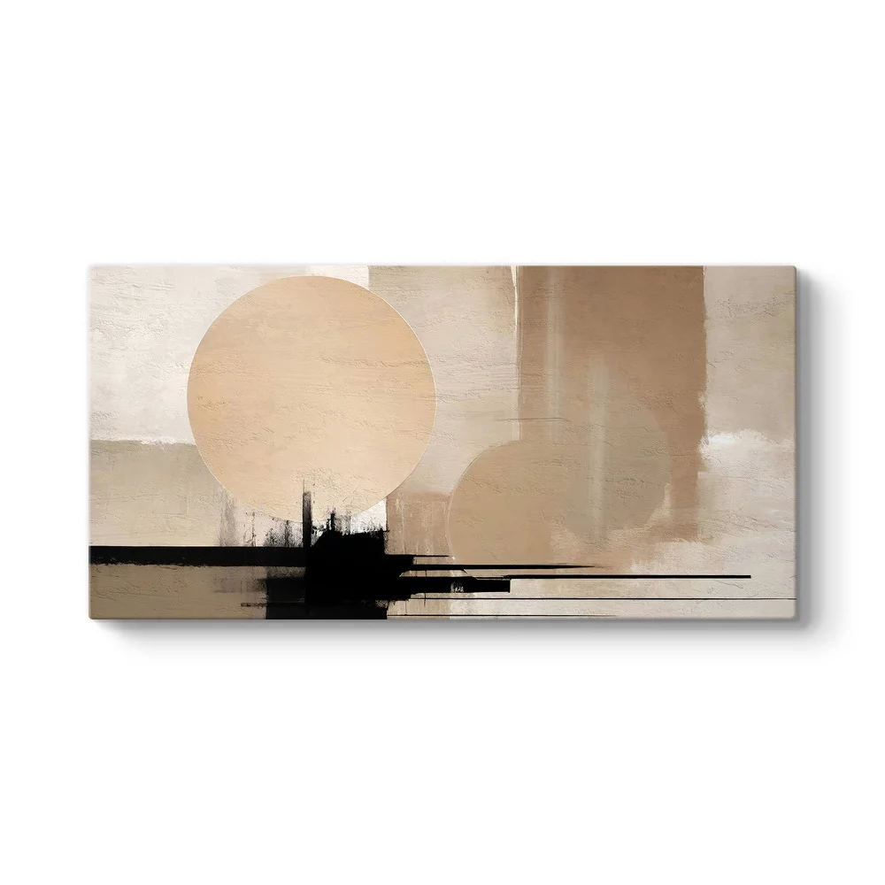 Denge Ufku Soyut Kanvas Tablo, yalın ama etkileyici bir duvar dekoru arayanlar için modern çizgilerle hazırlanmış seçkin bir tasarımdır. Bej, krem, taş ve siyah tonlarının dengeli birlikteliği sayesinde yaşam alanlarında göz yormayan, ferah ama güçlü bir atmosfer oluşturur. Büyük dairesel formlar ile yatay çizgilerin bir araya geldiği bu kompozisyon, mekana hem düzen hissi hem de çağdaş bir dekoratif etki kazandırır.