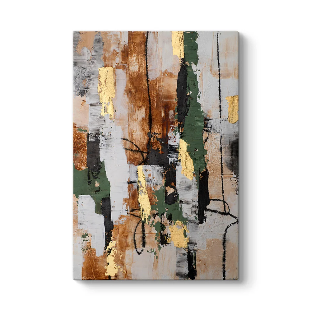 Doğanın en asil tonları, modern sanatın soyut diliyle duvarlarınıza geliyor. Bu etkileyici tasarım; zümrüt yeşilinin sakinliği, bronz ve kahve tonlarının sıcaklığı ile altın renkli detayların lüks etkisini birleştiriyor. Eskitme görünümü ve dikey kompozisyonuyla mekanınıza hem yaşanmışlık hissi hem de çağdaş bir hava katmak için özel olarak kurgulandı.